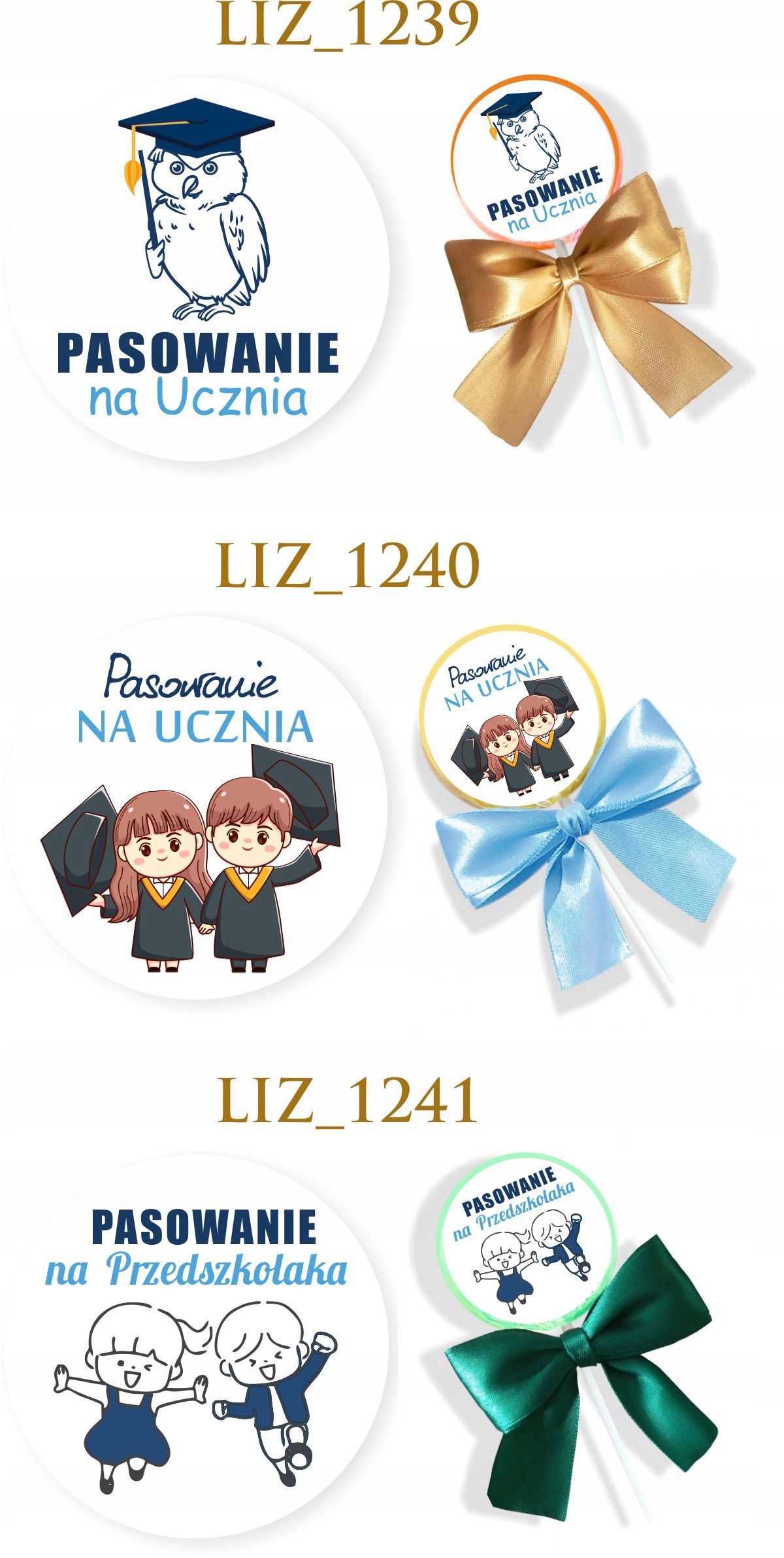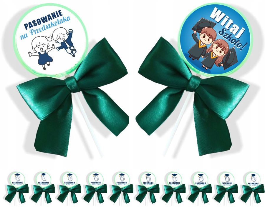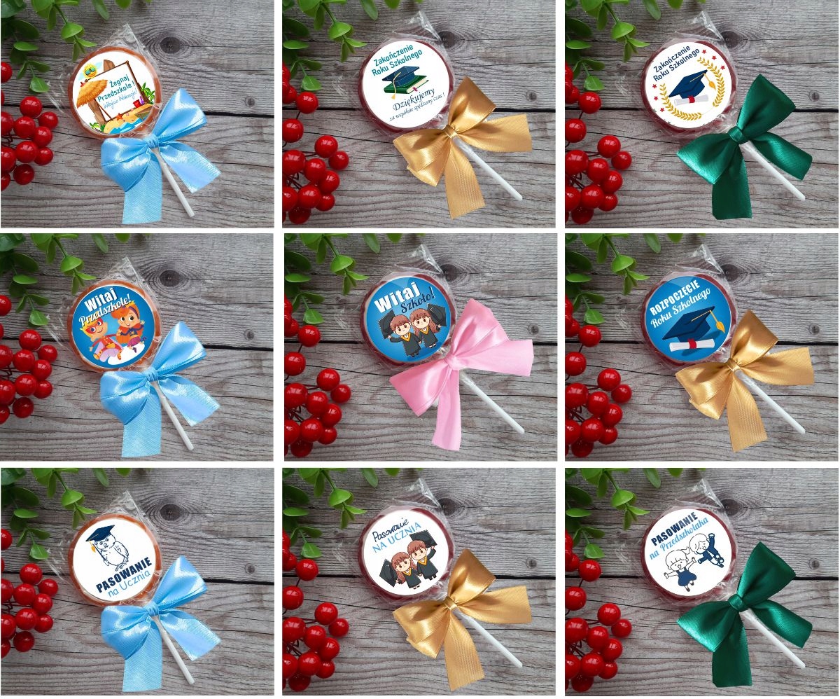 Lizak + naklejka + kokardka, wszystkie te produkty są pakowane w osobnych grupach, do samodzielnego złożenia (zmniejsza to ryzyko uszkodzenia w transporcie). Po otrzymaniu produktów należy samodzielnie nakleić gotową naklejkę oraz przymocować kokardkę. Kokardki są złożone i gotowe do aplikacji za pomocą przeźroczystej gumki.