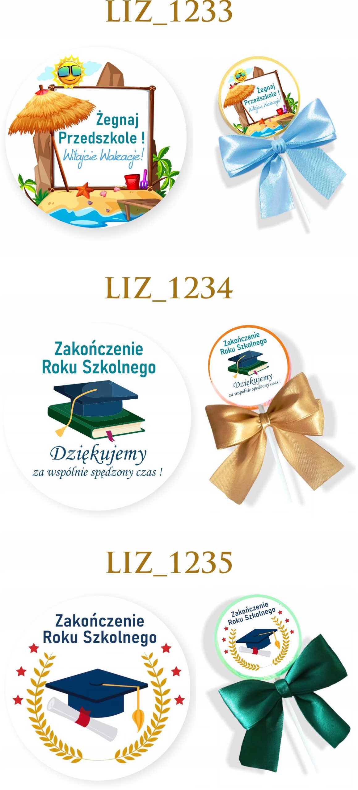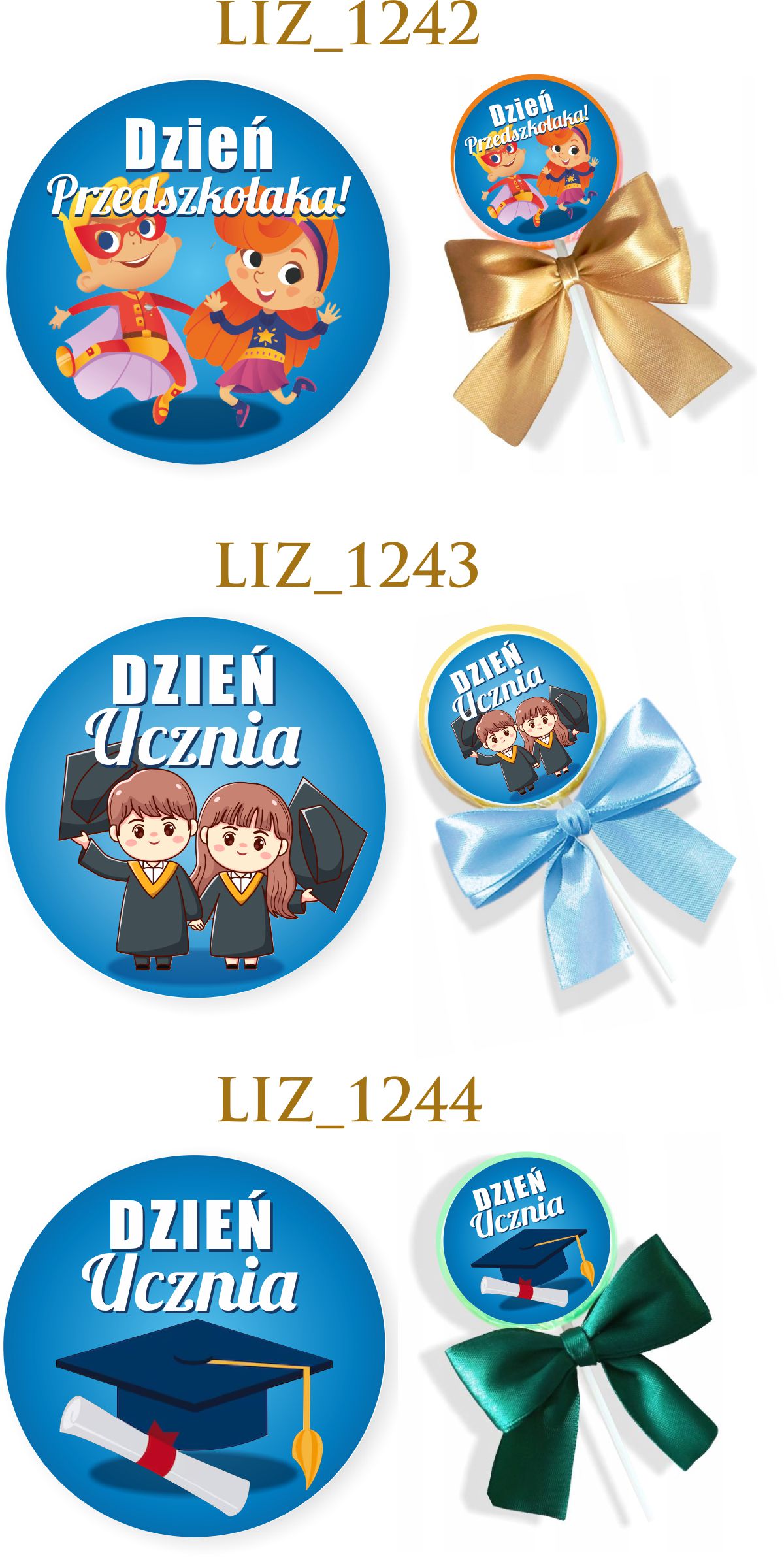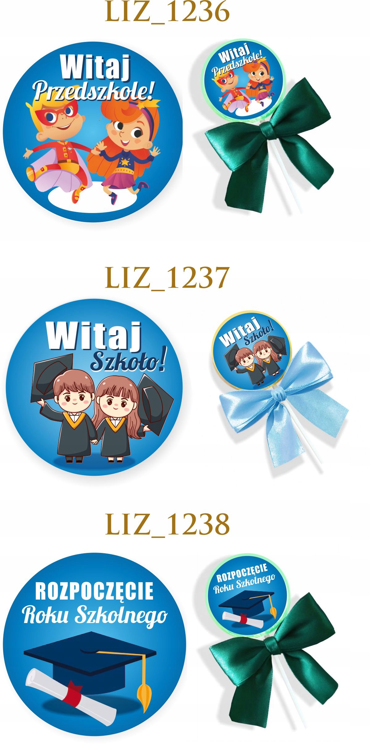 Lizak + naklejka + kokardka, wszystkie te produkty są pakowane w osobnych grupach, do samodzielnego złożenia (zmniejsza to ryzyko uszkodzenia w transporcie). Po otrzymaniu produktów należy samodzielnie nakleić gotową naklejkę oraz przymocować kokardkę. Kokardki są złożone i gotowe do aplikacji za pomocą przeźroczystej gumki.