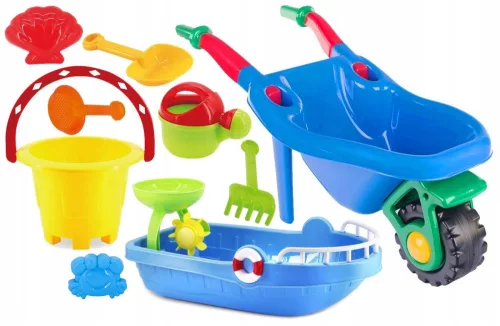 10-teiliges GROSSES SANDKASTEN-SET, Schubkarre + Boot und Zubehör