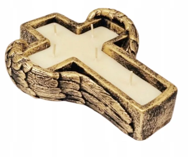 PIĘKNY ZNICZ OTWARTY W KSZTAŁCIE KRZYŻA KOLORZE CZARNO-ZŁOTYM Z SKRZYDŁAMI