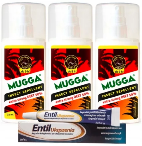 3× Mugga Deet Mücken- und Zeckenspray 50 % 75 ml + Entil Gel gegen Bisse Entil Bites 8 ml 8 g