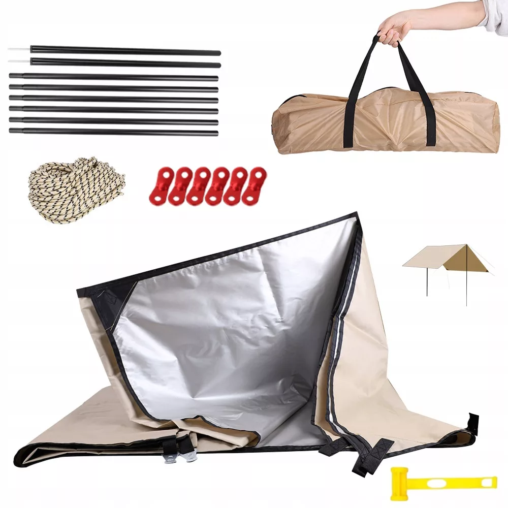 ⛱️WIELOFUNKCYJNA PRZENOŚNA MARKIZA: Wstępnie składana markiza jest dostarczana z małą torbą podróżną oxford, która pozwala uporządkować zestaw markizy namiotowej, dzięki czemu można ją zabrać wszędzie bez żadnych kłopotów. Niezależnie od tego, czy wybierasz się na plażę, do parku, spędzasz czas z rodziną na podwórku, czy też zajmujesz się biznesem, możesz rozłożyć markizę namiotu, po prostu używając dołączonych kołków do podłoża, aby wbić linę w trawę.