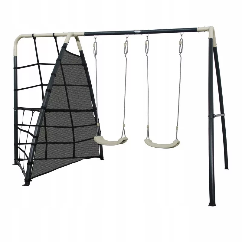 Ta podwójna huśtawka firmy Axi zawiera dwie huśtawki i siatkę do wspinaczki. Przeznaczony jest dla dzieci od 3 roku życia, a jego wymiary pozwalają na łatwy montaż w ogrodzie. Produkt ma 287 cm długości i 191 cm głębokości i tym samym zajmie powierzchnię 5,4 m². Ta metalowa bramka jest dostarczana jako zestaw i dlatego musi być zmontowana przez osobę dorosłą. W zestawie znajdują się kotwy niezbędne do prawidłowego zamocowania w gruncie. Konstrukcja tej huśtawki dla dzieci, wykonana jest z ocynkowanej stali, która jest wyjątkowo solidna i niewrażliwa na rdzę, która może ją uszkodzić. Nie ma konieczności konserwacji lub obróbki metalu. Siedziska do huśtawek są wykonane z polipropylenu, wytrzymałego i łatwego w czyszczeniu tworzywa sztucznego. Każda huśtawka może utrzymać maksymalny ciężar 50 kg, a jej wysokość można łatwo dostosować do wzrostu dziecka.