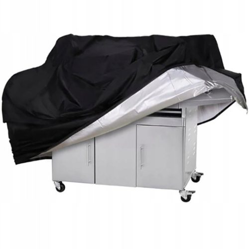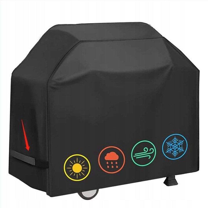 Czarny wodoodporny pokrowiec na grill ogrodowy, zapewniający ochronę przed promieniami UV oraz zapobiegający zabrudzeniom i blaknięciu. Doskonale zabezpiecza grill nawet w ekstremalnych warunkach atmosferycznych, takich jak deszcz, śnieg, intensywne słońce czy silny wiatr.