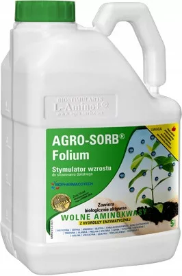 AGRO-SORB Folium to płynny dolistny biostymulator wzrostu zawierający naturalne, wolne L-α (lewoskrętne) aminokwasy powstałe z hydrolizy enzymatycznej zalecany szczególnie w okresach stresowych roślin.Powstał dzięki połaczeniu hydrolizy enzymatycznej i opatentowanej nowej bioaktywnej nanotechnologii ekstrakcji złożonej (biotransformacji) - L-AMINO+- organic nanotechnology.