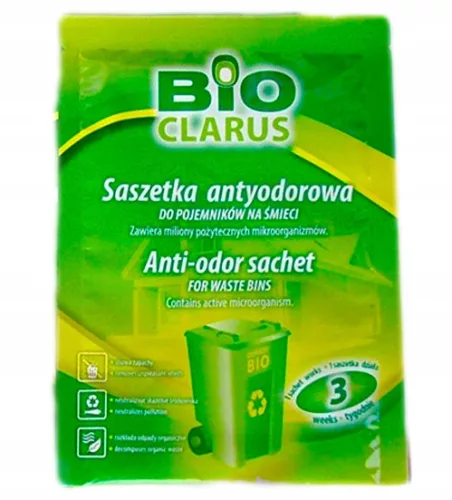 Bakteryjno-enzymatyczny preparat Bio Clarus przeznaczony jest do usuwania nieprzyjemnych zapachów powstałych na skutek zagniwania odpadów gromadzonych w koszach i kontenerach na śmieci. Może być stosowany bezpośrednio na odpady w celu zmniejszenia ich objętości. Wilgoć uaktywnia mikroorganizmy zawarte w preparacie w celu zmniejszenia ich objętości. Wilgoć uaktywnia mikroorganizmy zawarte w preparacie. Zagniwające odpady stanowią pożywkę dla rozwoju pożytecznych mikroorganizmów. Proces ten powoduje rozkład i neutralizację szkodliwych związków co zapobiega przedostawaniu się szkodliwych drobnoustrojów do środowiska.