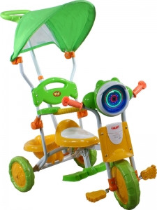 Dodatkowo istnieje możliwość złożenia podnóżka, dla dzieci, które mogą już same pedałować. Solidne piankowe kółka jeszcze bardziej zwiększają stabilność rowerka. W zestawie daszek chroniący dziecko przed słońcem oraz regulowany prowadnik do sterowania rowerkiem przez rodzica. Łatwy w montażu.