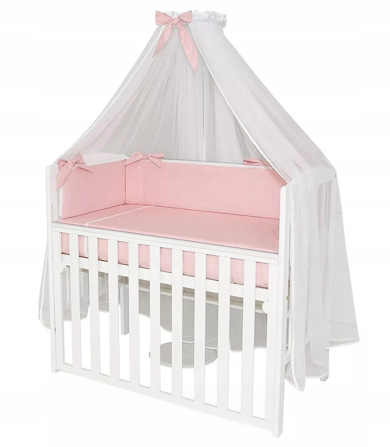 7. Ochraniacz na szczebelki 180 x 20 cm – wykończony bawełnianą koronką , wiązany na duże kokardy,  sztywny i gruby ochraniacz wykonany z prasowanej wlokniny , która zapewnia bardzo skuteczną ochronę przed uderzeniami główni dziecka o szczebelki.