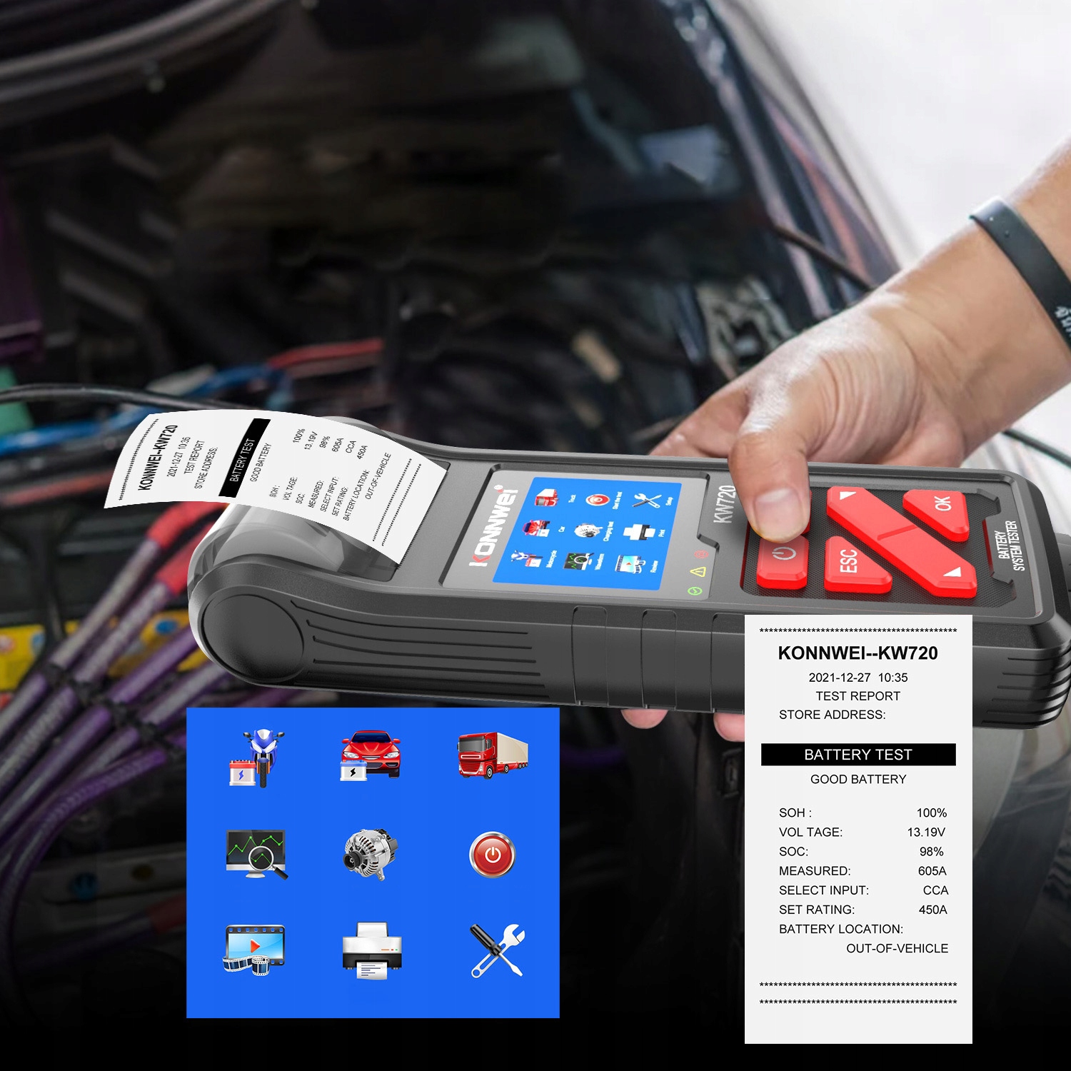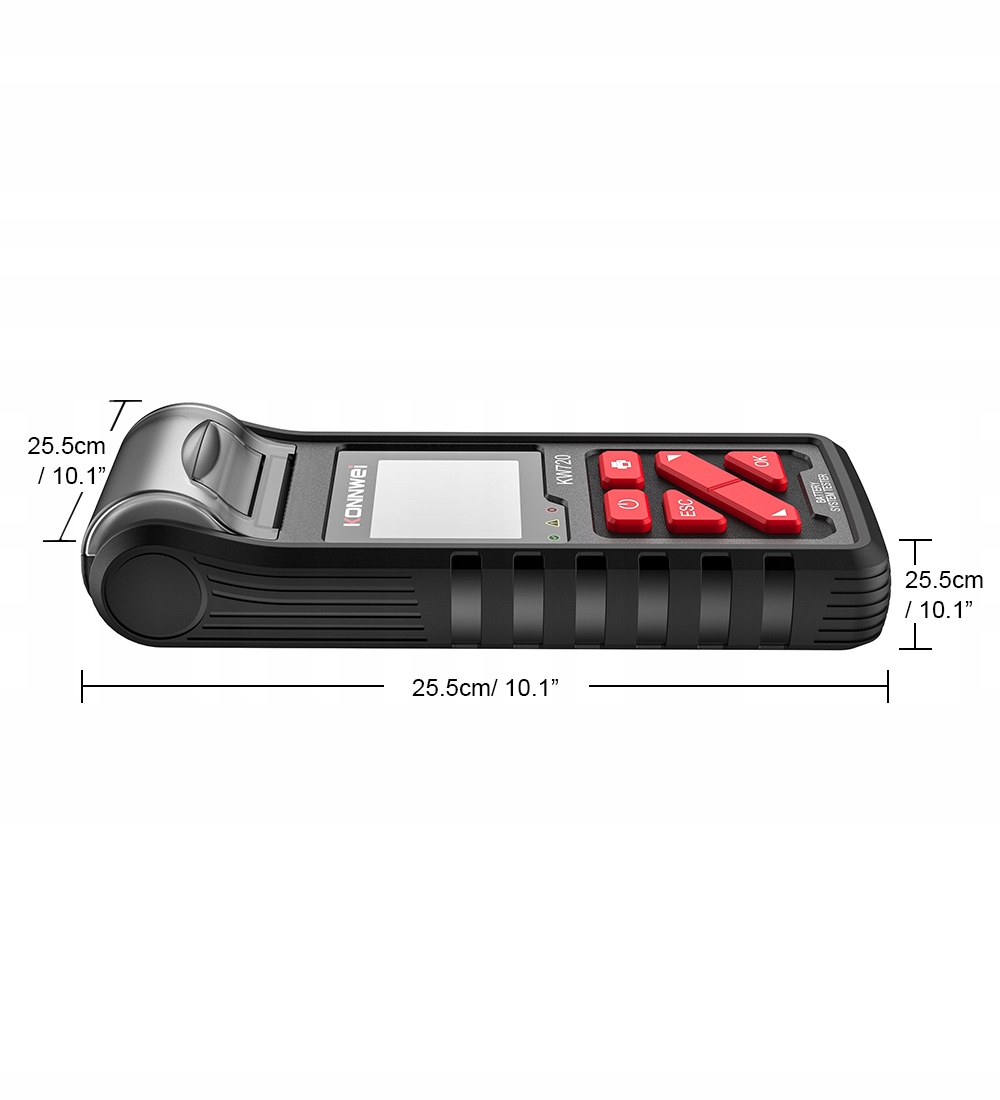 KONNWEI KW720 tester baterii wbudowana drukarka, wyposażona w standardowy papier do drukarki termiczny, może wydrukować ostatni wynik testu tego tester baterii bezpośrednio. Po wykonaniu testu można łatwo wydrukować wyniki testu, a następnie wkleić go na arkuszu roboczym. Obsługuje standardy akumulatorów do pojazdów, w tym jak CCA, BCI,CA,MCA,JIS,DIN,IEC,EN,SAE. Nadaje się do wszystkich akumulatorów ołowiowych 1V -30V w zakresie od 100 do 2000 CCA, w tym dołączonych, talerzach AGM, AGM spiral, GEL i EFB do części, łodzi, samochodów, motocykli, kosiarki do trawy i innych maszyn ogrodniczych itp.
