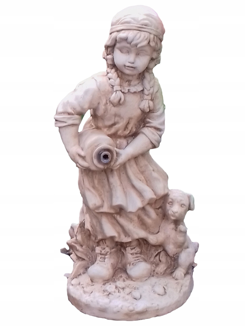 Figura betonowa fontanna, dziewczynka z psem wykonana z wysokiej jakości białego betonu odporna na działanie czynników atmosferycznych.