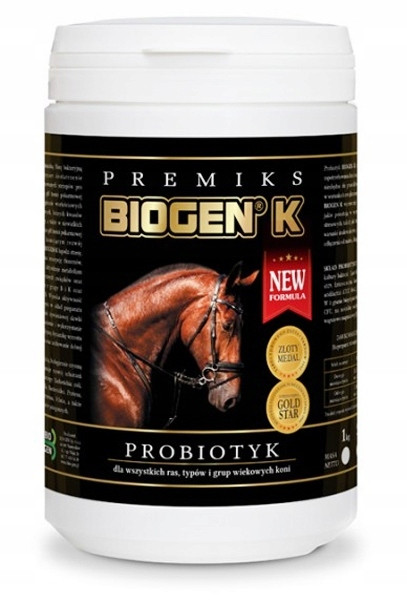 Biopreparat BIOGEN K to probiotyk dla koni zawierający najwyższej jakości mikroorganizmy o stężeniu właściwym dla przewodu pokarmowego konia. Receptura tego preparao do ponad 20 lat jest gwarancją jego skuteczności w poprawie zdrowiai koni o czym świadczą zarówno efekty jak i częste rekomnedowanie właśnie Biogenu K przez lekarzy weterynarii.