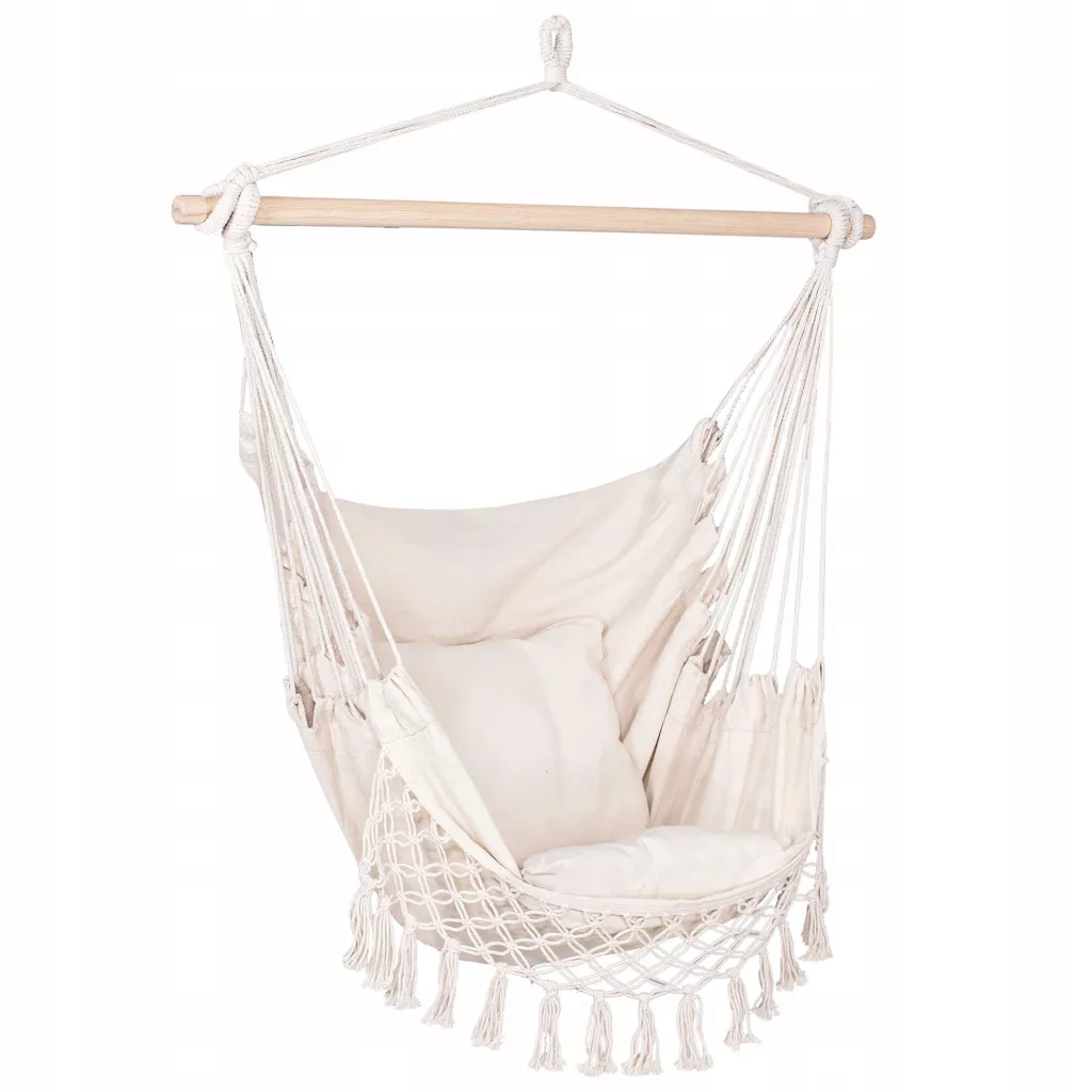 Zdecydowanym atutem jest wykonanie z naturalnych materiałów, w tym bawełny i drewna, które gwarantują nienachalny wygląd i maksymalną przepuszczalność powietrza. Lekki a jednocześnie wytrzymały materiał idealnie dopasowuje się do ciała. Zapewnia pełen relaks, w naturalnej, niewymuszonej pozycji. Kolorystyka i frędzle w stylu boho, trafiają idealnie w najnowsze trendy.