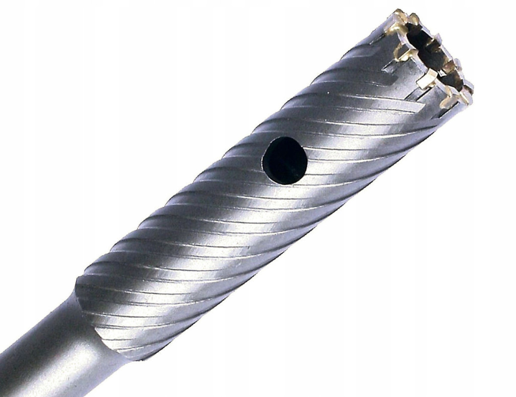 Otwór wentylacyjny w wiertle odprowadza ciepło i umożliwia usuwanie wiórów metalowych.