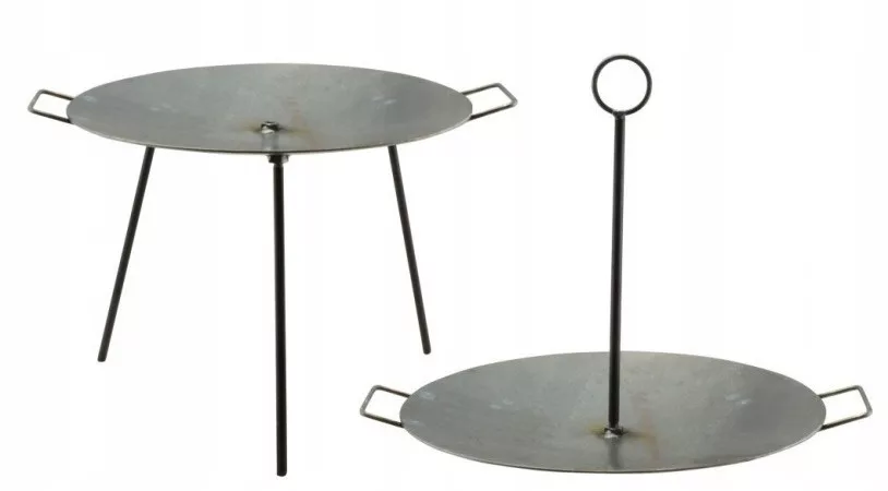 Patelnia ogniskowa z uchwytami na odkręcanych  nóżkach.
