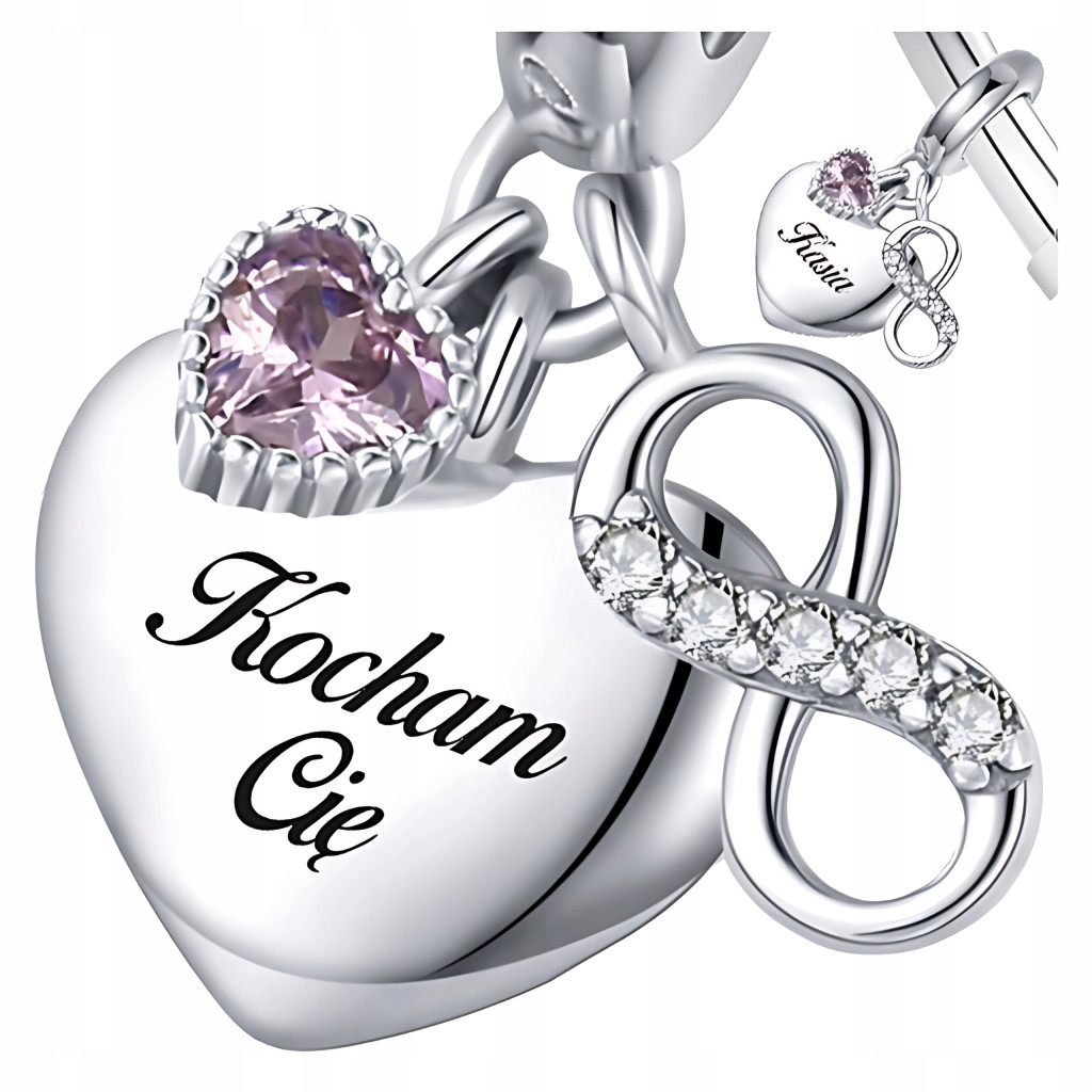 Zawieszka do bransoletki modułowej w kształcie serca z wygrawerowanym napisem "Kocham Cię", wiszącą różową cyrkonią i znakiem nieskończoności, to prawdziwy symbol miłości i wiecznego oddania. Ta srebrna zawieszka próby 925 wyraża głębokie uczucia, podkreślając trwałość i siłę relacji, które nigdy się nie kończą.