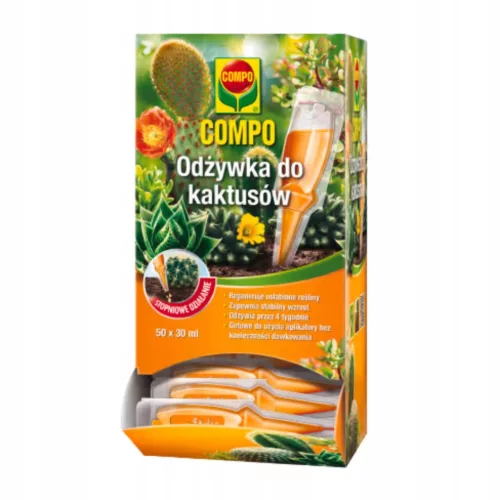 COMPO Nawóz do kaktusów to innowacyjna odżywka w postaci płynnego aplikatora, stworzona specjalnie do regeneracji i odżywiania kaktusów oraz innych sukulentów uprawianych w domu. Produkt wzmacnia system korzeniowy, poprawia kondycję roślin i stymuluje kwitnienie. Regularne stosowanie zapewnia zdrowy, sprężysty wygląd oraz intensywne wybarwienie roślin.