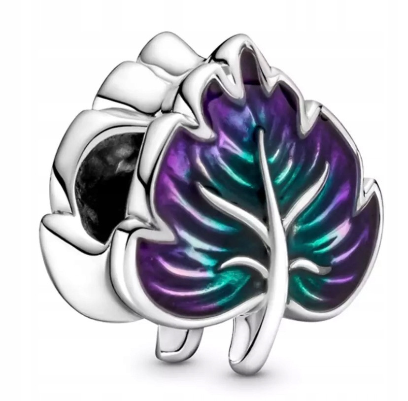 Wybierz ten charms aby dodać swojej bransoletce naturalnego akcentu. Charms wykonany ze srebra wykończony fioletową i zieloną emalią, która tworzy piękny efekt cieniowania na liściach przebłyskujących spod spodu. Liść to symbol nadziei, dlatego noś ten charms jako przypomnienie o swoich marzeniach i radosnych chwilach na łonie przyrody. Jego żywe kolory będą śmiałym uzupełnieniem Twojej stylizacji.
