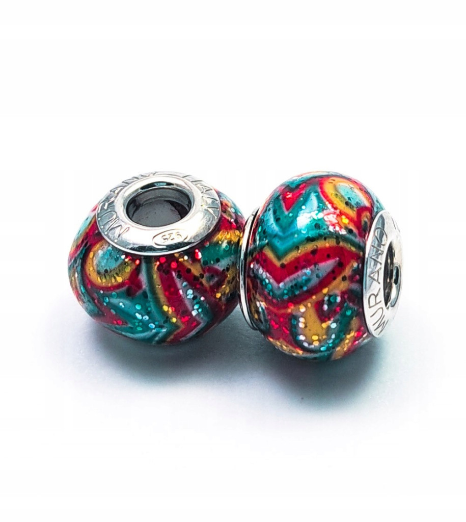 Charms zawieszka ze szkła Murano o wymiarach: 13 x 7 mm ze srebrnym insertem próby 925. Uniwersalna średnica otworu umożliwia zawieszenie koralika na wszystkich bransoletkach bazach w naszej ofercie, jak również na bransoletkach modułowych innych producentów. Koralik ze szkła Murano jest elementem biżuterii modułowej.