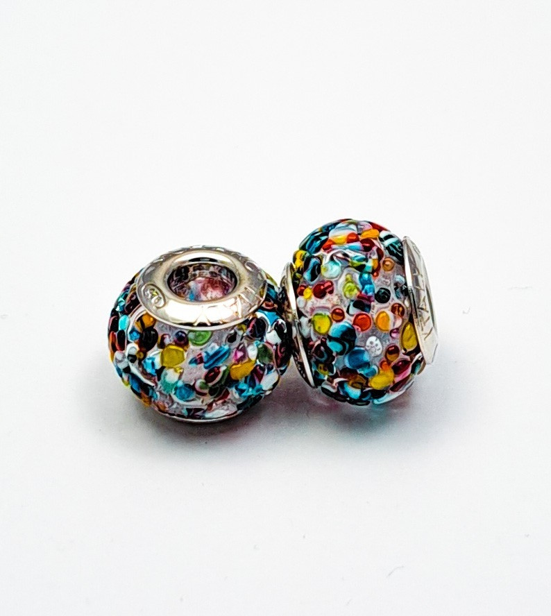 Intrygujący koralik ze szkła Murano i srebra. Delikatne tło i wiele kolorowych punkcików sprawia, że koralik prezentuje się wyjątkowo oryginalnie. Doskonale łączy się z wieloma charmsami z naszej oferty.