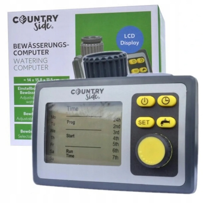 Sterownik nawadniania  pomoże indywidualnie zaplanować nawadnianie. Czytelny wyświetlacz LCD pokazuje wszystkie ustawienia z wyborem dni tygodnia. Sterownik jest zasilany za pomocą 2 baterii 1.5 AA .Wybierany rytm nawadniania od codziennego do 1 razu w tygodniu.