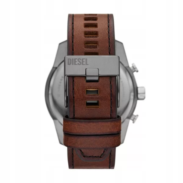 Oryginalny pasek do zegarka marki Diesel do modelu DZ4643, wykonany ze skóry naturalnej w kolorze brązowym, przeszyty nicią w kolorze paska,  sprzączka wykonana ze stali nierdzewnej w kolorze szarym matowym z napisem Diesel.