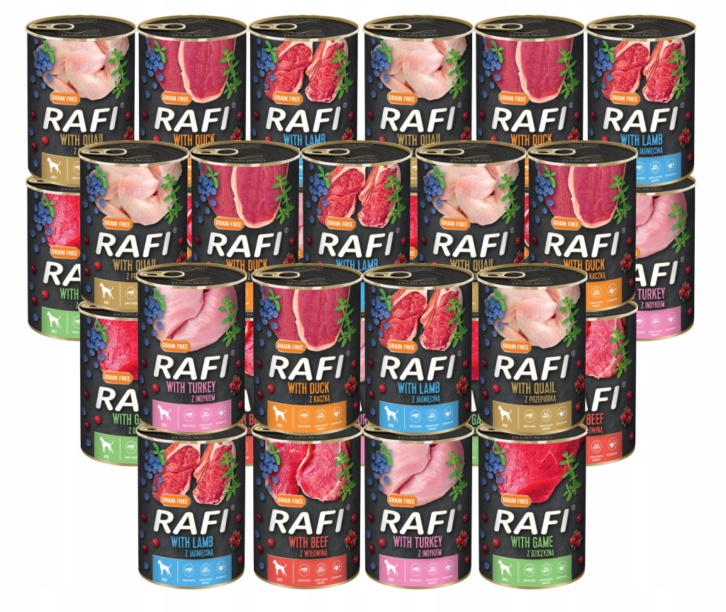 Linia RAFI to pełnoporcjowe karmy pokrywające w 100% dzienne zapotrzebowanie na wszystkie składniki odżywcze, mineralne i witaminowe. Ich skład został zbilansowany w oparciu o nowoczesne normy żywieniowe i zalecenia prawidłowego żywienia psów dorosłych, młodych oraz szczeniąt. Mokre karmy Rafi zapewniają odpowiednie zmineralizowanie kości i zębów oraz właściwy przebieg procesów metabolicznych. Receptura wolna jest od substancji konserwujących, barwników oraz aromatów poprawiających smak oraz stymulujących apetyt. Wykorzystanie mięsa i surowców pochodzenia zwierzęcego oraz ich precyzyjne zestawienie sprawiają, że produkty te są źródłem pełnowartościowego białka zawierającego wszystkie aminokwasy egzogenne. Dzięki nowoczesnej metodzie produkcji oraz starannej selekcji karmy Rafi odznaczają się wysokim współczynnikiem strawności.