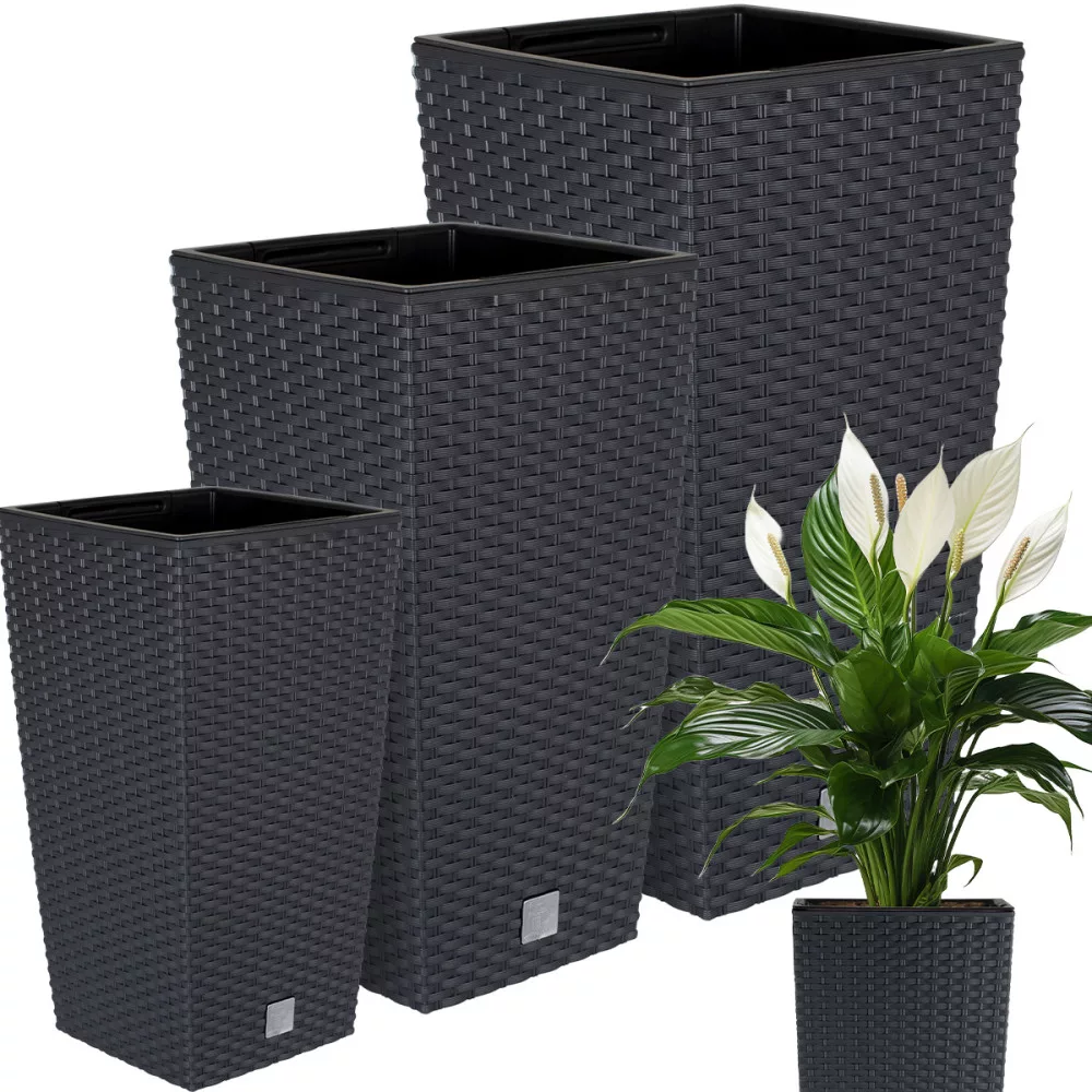 SET 3x BLUMENTOPF BALKON BLUMENTOPF RATTAN BLUMENSTÄNDER ANTHRAZIT + 3 EINSÄTZE