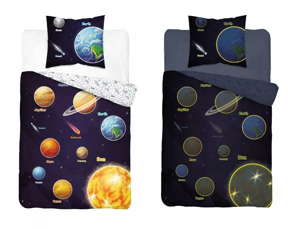 Im Dunkeln leuchtende Bettwäsche 140x200 Weltraumplaneten, Marineblau, bunt