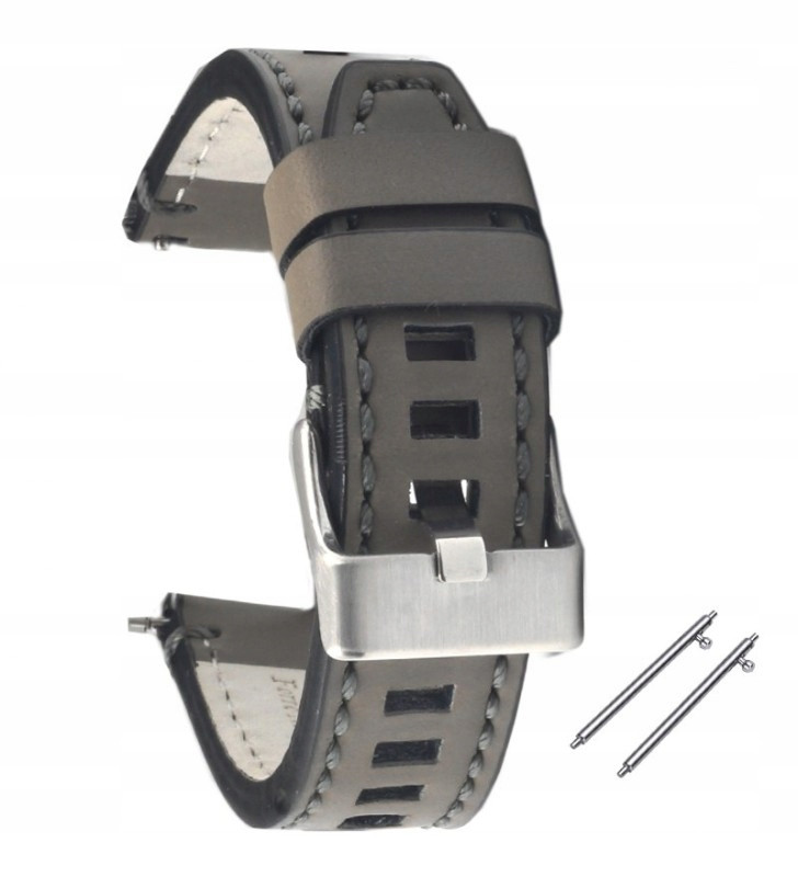 Skórzany pasek do zegarka  w kolorze szarym z przeszyciem. Pasek tenłatwo dopasowuje się do ręki jest miękki i elastyczny. W pasku osadzono klamerkę w kolorze Srebrnym. Dodatkowo montaż paska odbywa się przy użyciu teleskopów Quick Pin