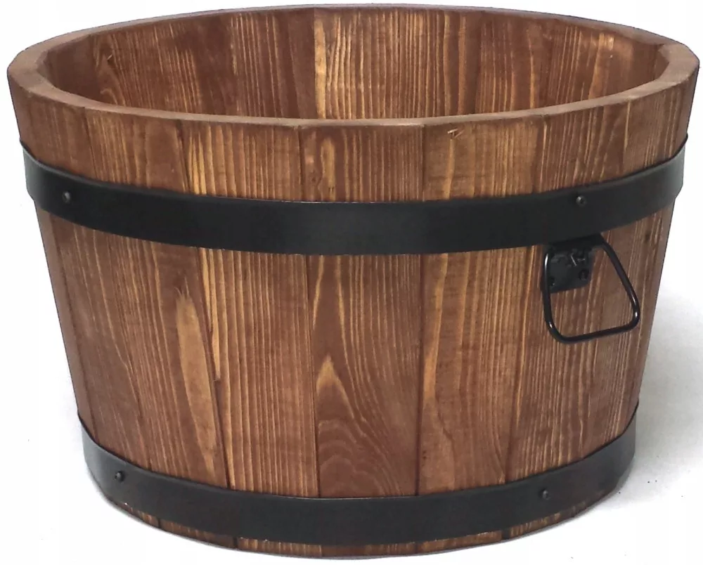 Donica posiada otwór drenażowy w grubym dnie z drewna sosnowego.