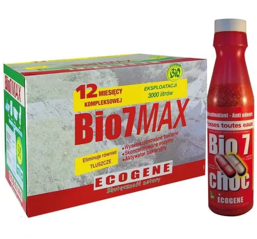 Bio7 Max to biopreparat dwufazowy, przeznaczony w szczególności do instalacji nie wyposażonych w separator tłuszczu. Biopreparat eksploatacyjny został dodatkowo wzbogacony o wyselekcjonowane bakterie i enzymy rozkładające tłuszcze. Specjalna receptura 2w1 opracowana została tak aby jeszcze bardziej poprawić pracę oczyszczalni ścieków poprzez wyeliminowanie problemu zatłuszczenia instalacji. Składniki preparatu zapobiegają powstawaniu tzw. „kożucha tłuszczowego” oraz chronią przed zatorami tłuszczowymi elementy funkcjonalne instalacji (rury, przepompownie, drenaże, studnie chłonne).