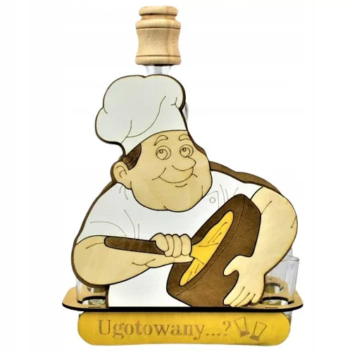 • drewnianą podstawę ,wycinaną laserowo z kucharzem i napisem .... Ugotowany?...