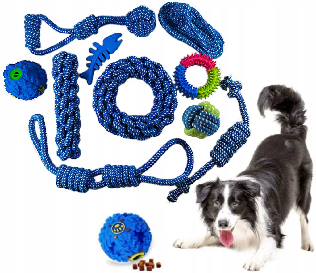 Ein Set mit 10 Hundespielzeugen: ein Ball mit Leckerlis, Kausnacks und Beißspielzeugen