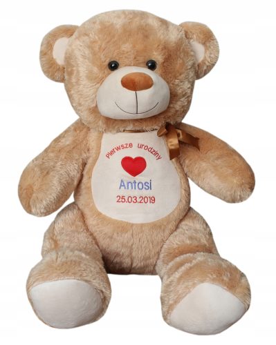 Pragnę zaprezentować Państwu super maskotkę.Na brzuchu misia znajduje się wyhaftowane imię data oraz aplikacja serduszka.