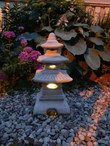 Eine Gartenfigur einer Pagode, eine japanische Lampe, eine Laterne