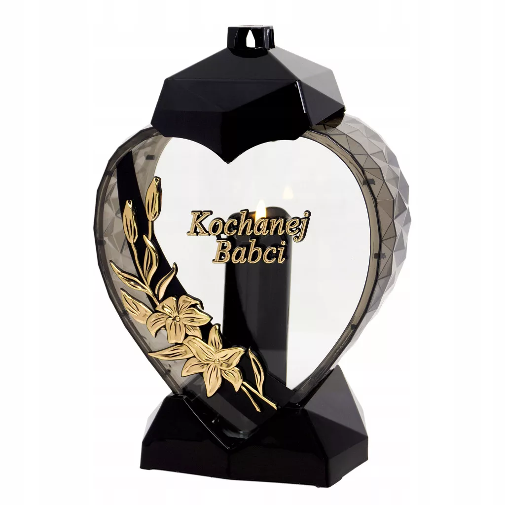 Duży czarno-złoty znicz w kształcie serca z kwiatem lilii dla Babci