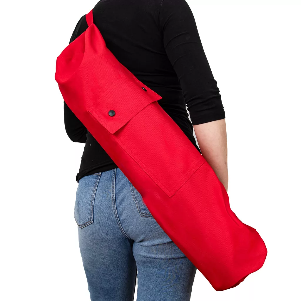 ✅ czerwony bawełniany pokrowiec na matę do jogi z dodatkowa kieszenią na portfel, klucze, telefon czy butelkę wody.