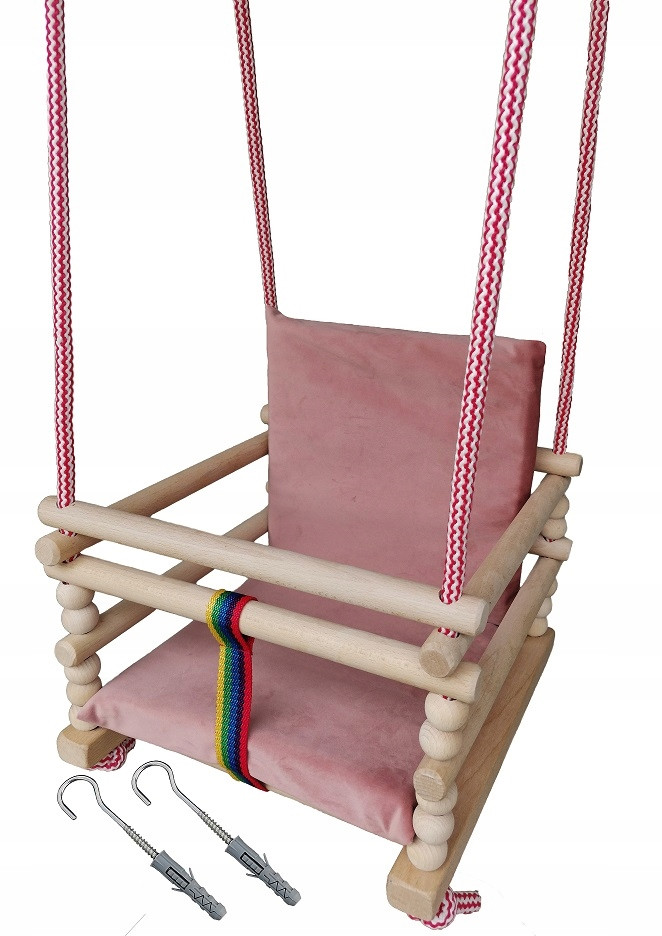 Huśtawka dla dziecka wykonana z selekcjonowanego drewna bukowego przez stolarza z wieloletnim doświadczeniem. Elementy drewniane są wyszlifowane, krawędzie zaoblone. Wyrób spełnia rygorystyczne normy bezpieczeństwa. Huśtawka ma spory udźwig wynoszący 20 kg. Ponad to wyposażona jest w taśmę zabezpieczającą przed wypadnięciem podczas zabawy. Drewniana huśtawka zawieszona jest na wytrzymałych poliestrowych sznurach o średnicy 10 mm. Liny nośne zakończone są metalowymi ocynkowanymi pierścieniami, które pozwalają na szybki montaż/demontaż huśtawki na hakach (dołączonych do huśtawki).