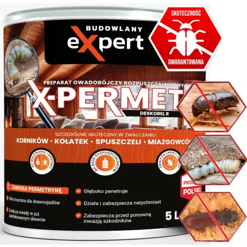 Preparat X-permet marki BUDOWLANY EXPERT do zwalczania drewnojadów i przeciwdziałania pojawianiu się larw szkodników drewna.