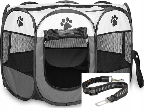 Składany, ośmiokątny kojec wykonany z wytrzymałej, wodoodpornej tkaniny. Przeznaczony jest dla psów małych i średnich oraz kotów, szczeniąt i innych zwierząt. Kojec świetnie się sprawdza zarówno wewnątrz, jak i na zewnątrz pomieszczeń. NIE NADAJE SIĘ DLA PSÓW AGRESYWNYCH.
