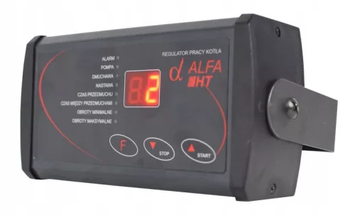 Sterownik charakteryzuje się bardzo prostą obsługą, posiada jednak wszystkie funkcje niezbędne do prawidłowej pracy kotła. Użytkownik ma do swojej dyspozycji prosty i funkcjonalny panel sterowania, umożliwiający zaprogramowanie temperatury pracy w zakresie 35 - 90°C, programowanie czasu przedmuchu w szerokim zakresie, a także obrotów dmuchawy. Łatwo stteruje płynnie także wentylatorami wyciągowymi np modelami WWK 180/60W-75W. Alfa posiada również możliwość zaprogramowania temperatury załączenia pompy w zakresie 35-60°C. Dla podniesienia bezpieczeństwa pracy regulator ten można wyposażyć w zewnętrzny termostat awaryjny.