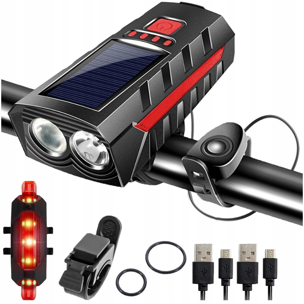 W takim razie zainteresuje Cię zestaw z lampką solarną na przód, lampką na tył i klaksonem rowerowym!
