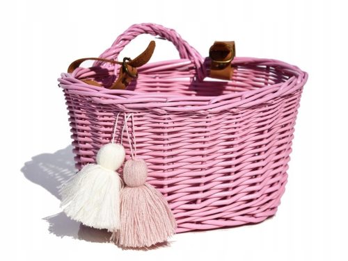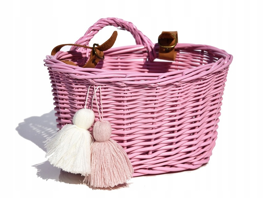 Koszyczek wiklinowy prosto z serca polskiego zagłębia wikliniarskiego. Wykonany przez wykwalifikowanych rzemieślników, następnie profesjonalnie pomalowany ekologiczną farbą na piękny różowy kolor. W zestawie otrzymują Państwo również niezbędne po przypięcia koszyczka paski (założone  już na kosz) oraz dwa chwosty, jeden w kolorze pudrowego różu , drugi biały.