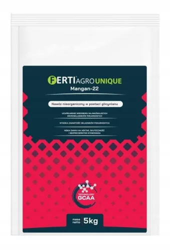 Ferti Agro Unique Mn to specjalistyczny, nieorganiczny nawóz mikroskładnikowy, zawierający mangan w postaci glicynianu. Dzięki tej formie mangan jest szybciej wchłaniany, przemieszczany i przyswajany przez rośliny, co zapewnia ich optymalny rozwój. Produkt skutecznie uzupełnia niedobory manganu, który jest kluczowy dla wielu roślin, w tym w warunkach, gdzie dostępność manganu w glebie jest ograniczona.