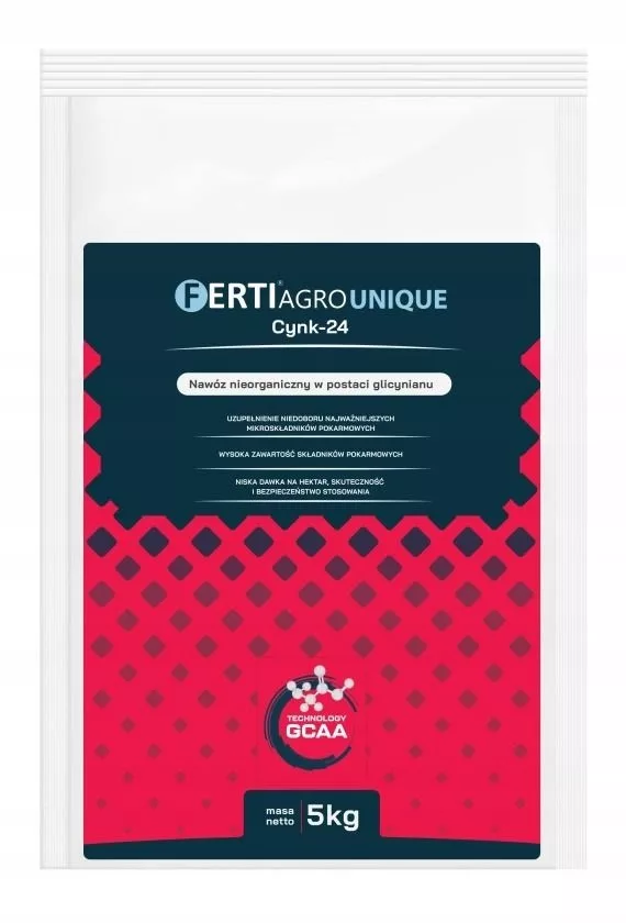 Ferti Agro Unique Zn to nawóz dolistny z cynkiem w postaci glicynianu. Jest nawozem specjalistycznym, nieorganicznym i mikroskładnikowmy, zawierającym cynk w postaci glicynianu, co zapewnia wyjątkową przyswajalność przez rośliny. Dzięki wysokiej zawartości cynku, nawóz efektywnie uzupełnia niedobory tego mikroelementu, wspierając zdrowy rozwój roślin, zwłaszcza tych o wysokich wymaganiach w stosunku do cynku.