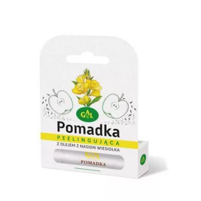 Pomadka peelingująca GAL wzbogacona jest olejem z nasion wiesiołka. Pomadka zapewnia natłuszczenie ust. Drobinki pestek jabłka złuszczają naskórek dzięki czemu usta są miękkie i wygładzone.