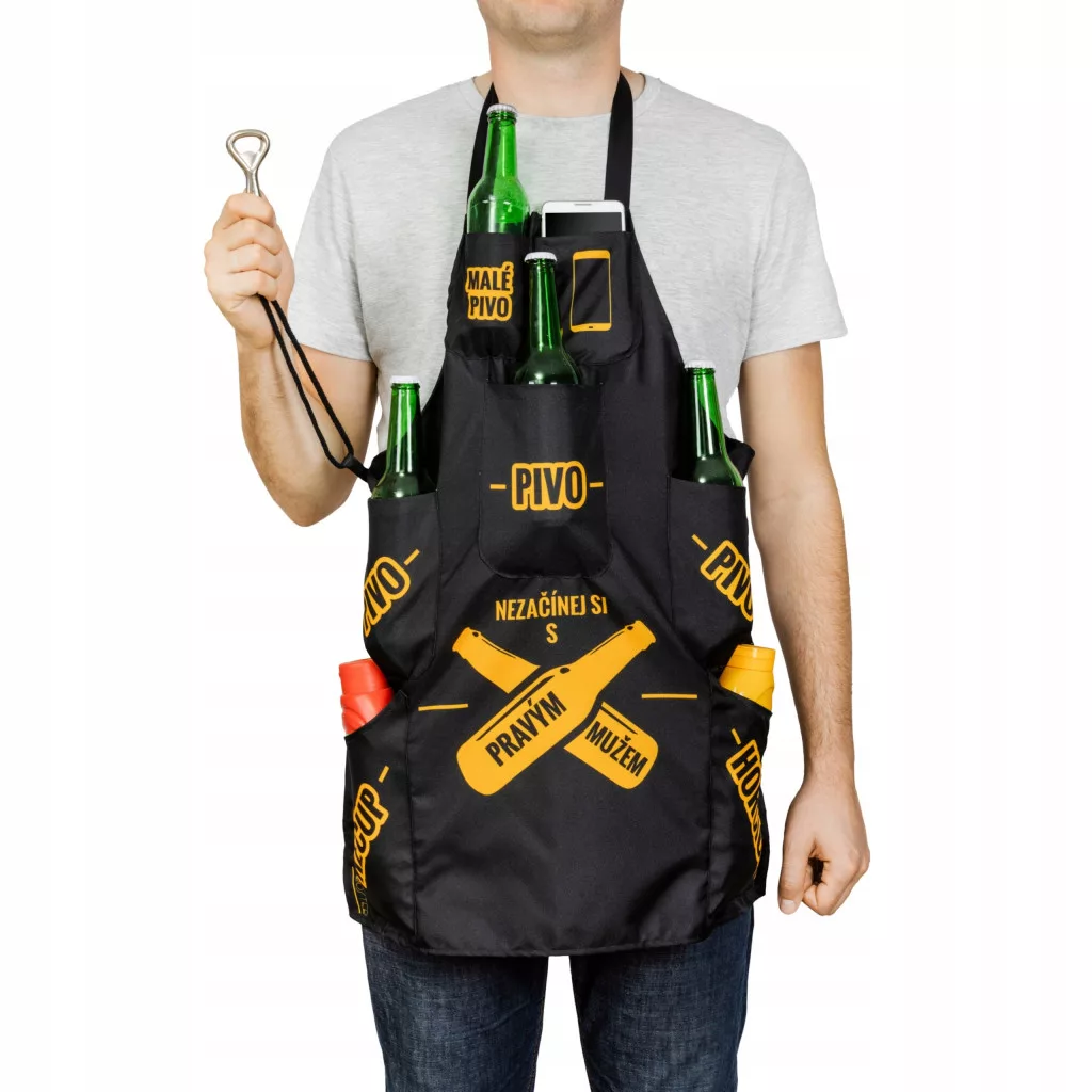 Kieszenie fartucha pomieszczą: 3 piwa (butelki 0,5 l), jedno małe piwo, otwieracz do butelek, telefon, musztardę i keczup.