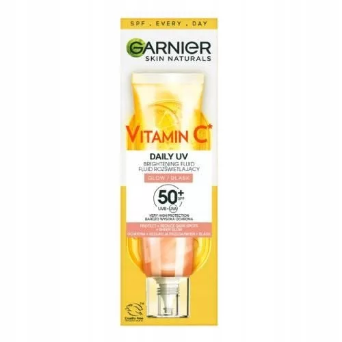 Lekki fluid na dzień Garnier Skin Naturals Vitamin C nadaje skórze blasku, łączy w sobie rozświetlającą moc witaminy C z filtrem SPF50+ o bardzo wysokim stopniu ochrony. Natychmiast po aplikacji skóra jest bardziej promienna i chroniona przed promieniowaniem UVB oraz krótkim i długim promieniowaniem UVA, co pomaga zapobiegać oznakom fotostarzenia, między innymi przebarwieniom.