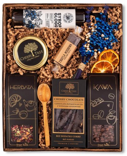 Kosz prezentowy zestaw herbata kawa czekolada wiśniowa trufla syrop kwiaty
