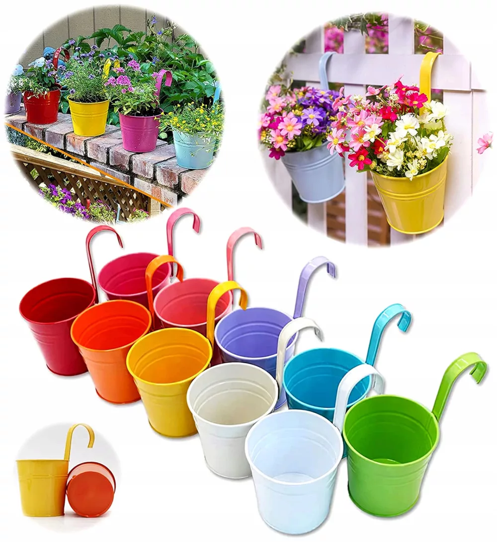BUNTE RUNDE GROSSE BLUMENTÖPFE AUS METALL MIT HAKEN 10x